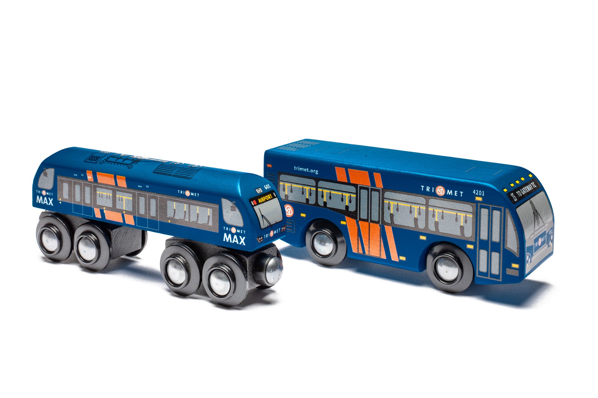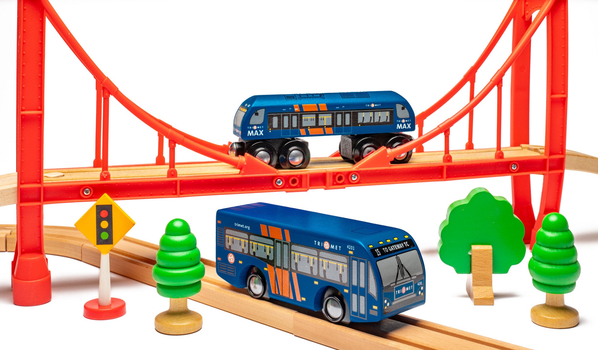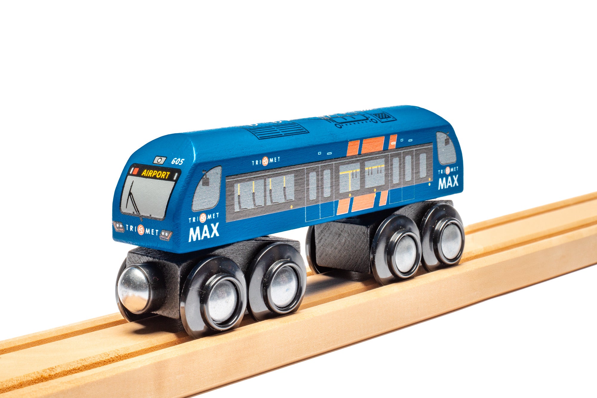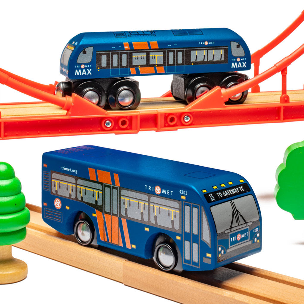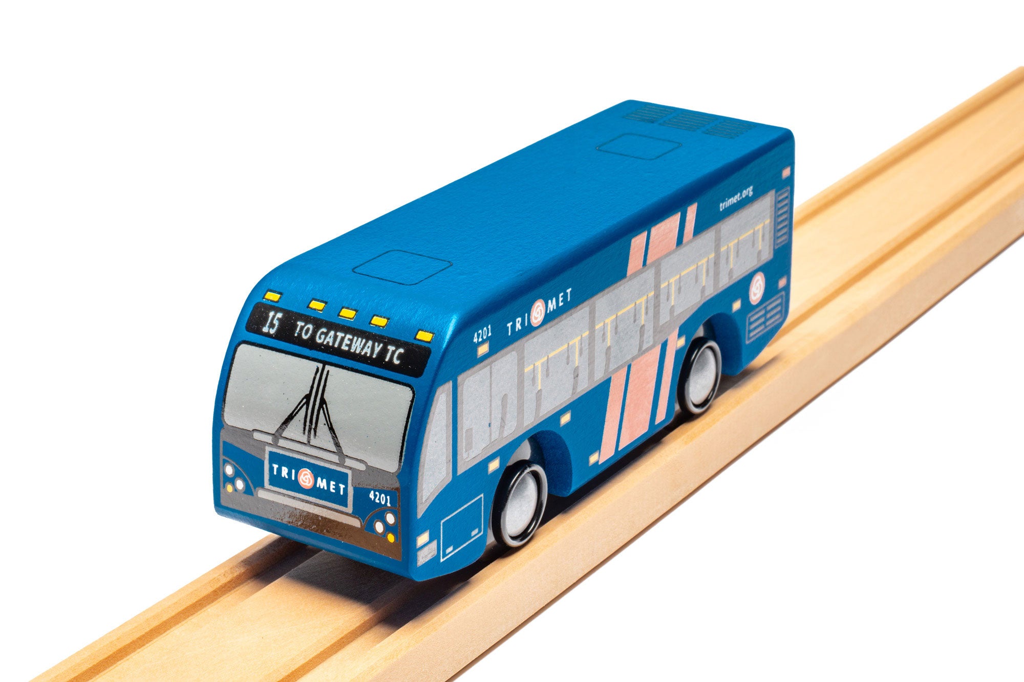 The bus does not have magnets and won’t connect to trains or other vehicles. It can run on or alongside wooden train tracks for open-ended play.